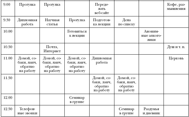 Я предложила ему использовать это часовое окно в первую очередь для написания учебного плана. Для этого ему не нужна была помощь других людей или библиотека. С течением времени этот утренний рабочий ритуал войдет у него в привычку, и, закончив с учебным планом, он сможет переместить в этот интервал подготовку проповедей. И тогда время в четверг, прежде предназначенное для написания проповеди, он волен посвятить работе над своей диссертацией.