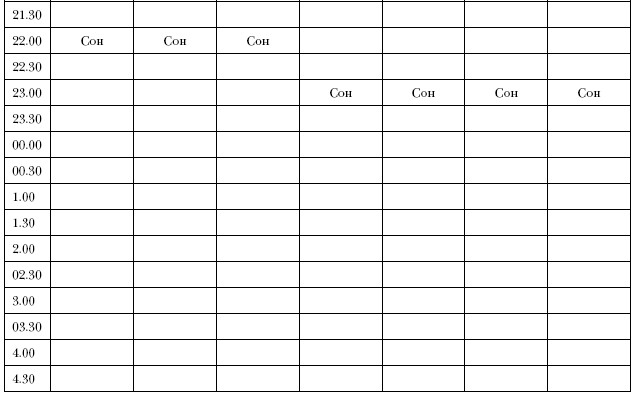 Теоретически было возможно выделить 4 блока времени по 2 часа каждый. Детей у Роеша не было, и он сказал, что ничто не мешает ему работать допоздна. Однако людям, которые начинают свой день в 5 утра, бывает трудно заниматься интенсивным умственным трудом уже около 19 вечера. Кроме того, я остерегаюсь чересчур плотной загрузки дня – мне приходилось видеть расписания, в которых совещания занимали по 7 часов рабочего времени. Жизнь не стоит на месте. А если вы уже обязаны отдать 7 часов своего времени, то реагировать на возникающие по ходу дела проблемы или благоприятные возможности будет некогда. Таким образом, Даррену лучше было попробовать 4 блока по часу в каждом и посмотреть, что из этого получится.