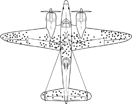 Адаптировано из изображения Creative Commons. Макгеддон «Иллюстрация гипотетической картины повреждений бомбардировщика Второй мировой войны». Wikimedia Commons, 12 ноября 2016 года, https://commons.wikimedia.org/wiki/File: Survivorship-bias.png.