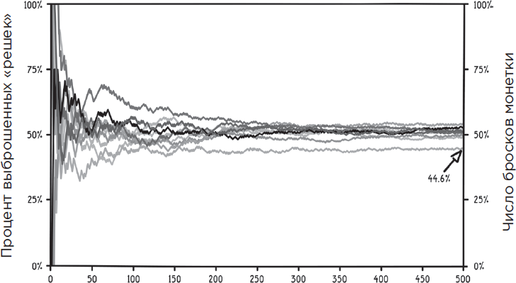 График ниже демонстрирует это в действии. Каждая линия представляет собой серию бросков монетки и показывает, как процент выброшенных «решек» меняется с первого до пятисотого броска в каждой серии. Обратите внимание, что кривые могут довольно сильно отклоняться от отметки 50 % в начале, но приближаются к этому числу все сильнее и сильнее по мере увеличения числа бросков. И даже после пятисотого броска некоторые числовые данные все еще далеки от 50 %.