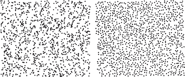 Эти картинки взяты из книги психолога Стивена Пинкера «Удачные ракурсы нашей натуры». Левая картинка, на которой очевидны кластеры, на самом деле случайная. Правая картинка, которая интуитивно кажется случайной, на самом деле такой не является. Это фотография светлячков на своде пещеры в Вайтомо, Новая Зеландия. Светлячки специально рассаживаются подальше друг от друга в борьбе за еду.