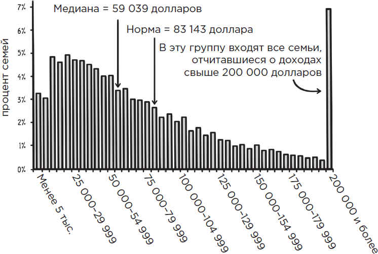 Чтобы проиллюстрировать это, ниже мы рассмотрим другую гистограмму, которая показывает распределение семейных доходов в США в 2016 году. Этот набор данных также имеет один пик, 20 000–24 999 долларов, но он асимметричен, смещен вправо. (Все доходы свыше 200 000 долларов сгруппированы в один столбик. Если этого не сделать, график будет иметь длинный хвост, уходящий далеко вправо.) В отличие от температуры тела, медианный доход в размере 59 039 долларов сильно отличается от среднего дохода в размере 83 143 доллара. Всякий раз, когда данные искажаются в одном направлении, как здесь, норма отодвигается от медианы в сторону смещения, так как ее сдвигают крайние значения.