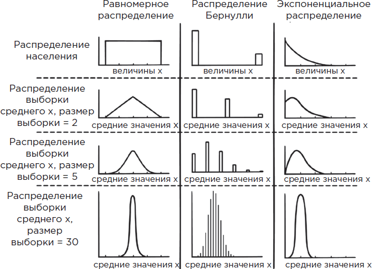 Но мы назвали этот раздел «Кривая нормального распределения», поскольку нормальное распределение особенно полезно благодаря одному из самых практичных результатов во всей статистике, который называется центральной предельной теоремой. Эта теорема утверждает, что когда числа взяты из одного и того же распределения, а затем усреднены, полученный средний результат примерно соответствует нормальному распределению. Так получается даже тогда, когда изначальные числа взяты из совершенно иного распределения.
