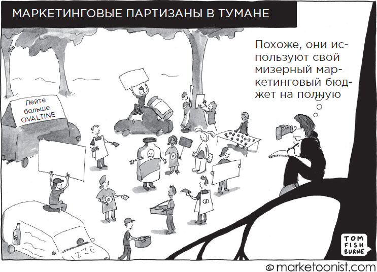 Эта идея имеет прямую параллель в партизанском маркетинге, в основе которого лежит использование нетрадиционных методов для продвижения своих продуктов и услуг при относительно небольших бюджетах. Один из примеров такого маркетинга – вирусные ролики, часто напрямую нацеленные на более крупных конкурентов. Например, сервис подписки на доставку бритвенных принадлежностей Dollar Shave Clib запустил свой продукт через вирусное видео. Несмотря на то что он не мог конкурировать с более крупным бизнесом на их условиях (например, делать дорогостоящую рекламу на ТВ и в журналах), их дерзкое первое видео под названием «У нас о***нные бритвы» дало мощный толчок для дальнейшего стремительного развития, которое принесло миллиард долларов.