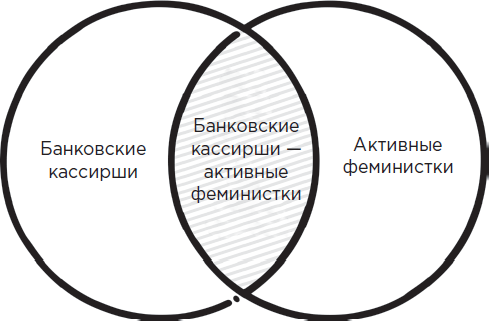 В исследовании большинство людей считало второй вариант более вероятным, но этого просто не может быть, если только не все банковские кассирши – активные феминистки. Ошибка возникает, потому что вероятность двух совместных (конъюнктивных) событий всегда меньше или равна вероятности каждого из них по отдельности. Эту идею иллюстрирует диаграмма Венна.