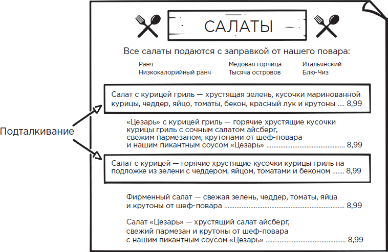 Например, рестораны подталкивают вас к выбору определенного блюда, вынося их на отдельные вкладки, заставляя официантов предлагать блюдо дня или просто обводя в рамку конкретные пункты меню. А магазины и сайты подталкивают к покупке конкретных товаров, помещая их на видное место.
