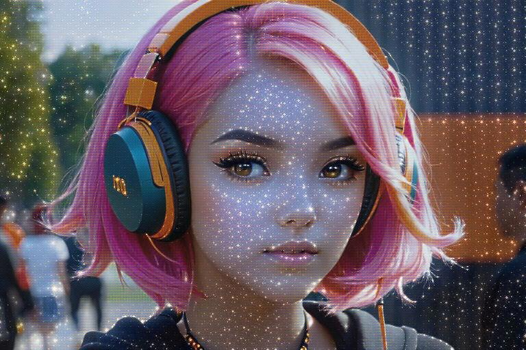 Волосы у неё по-прежнему были розовыми, но, кажется, чуть темнее, чем раньше. Рубашка в белую и оранжевую полоску поверх белого топика, широкие светло-розовые штаны с многочисленными карманами, за спиной – пёстрый рюкзачок. Образ дополняли большие оранжевые наушники.