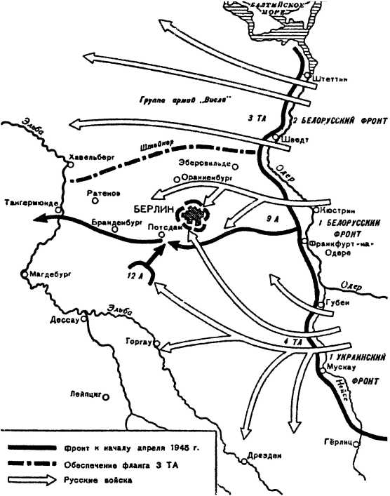 4-я танковая армия, как уже говорилось, не могла выполнить настойчивое требование немецкого командования, заключавшееся в том, чтобы ударом на север совместно с 9-й и 12-й армиями и оперативной группой Штейнера принять участие в битве за Берлин. Это объяснялось тем, что она имела очень мало соединений, способных наступать. Ее войска, действовавшие на широком фронте, в первых числах мая были оттеснены к Рудным горам.
