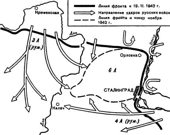 Вскоре русские начали развертывать свои силы для наступления. Немцы, разумеется, знали о подготовке этого наступления, но ничем не могли его задержать, так как вся их авиация была занята под Сталинградом. Под руководством генерала Василевского русские создали две ударные группировки – Донской фронт под командованием генерала Рокоссовского на плацдарме в районе Кременской (21 стрелковая дивизия, а также 3 танковых и 2 кавалерийских корпуса) и Сталинградский фронт под командованием генерала Еременко, развернувшийся южнее Сталинграда (в его составе было 9 стрелковых дивизий и 2 танковых корпуса).