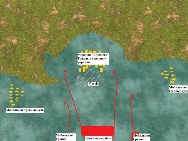 Враг действовал от обороны, пытаясь использовать сильные стороны каждого типа своих кораблей. Размеры и площадь палуб ти-шадайских парусников сочетать с атаками мобильных групп гребных судов.