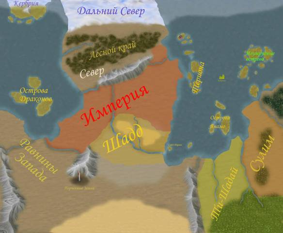 Некоторые дикие земли типа Дальнего Севера или Кербрии тоже нашли отражение на полотне, так как о них что-то было известно. Этих медвежьих углов можно было достичь по морю. При Георе некоторые работорговцы любили поохотиться на дикарей Дальнего Севера. Про Кербрию все больше на слуху были мифы, а не факты, но и там кто-то когда-то бывал. Гораздо меньше информации у местных цивилизаций было о тех землях, что лежали далеко на Юге. Непроходимые джунгли и бескрайние пустыни мешали путешествиям. Иногда оттуда приходили племена наподобие Тайбров, чтобы наняться к кому-то на службу. Но и они не очень представляли какие земли лежат еще дальше на юг.