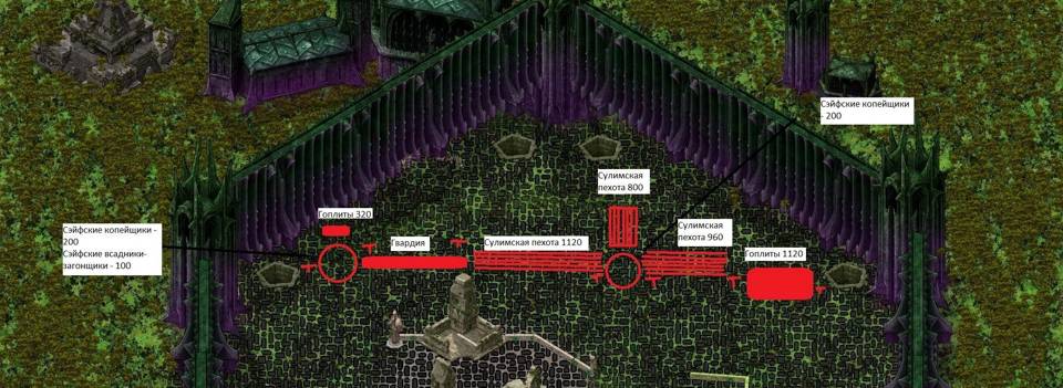 Восточнее стояли сэйфы из отряда Нималексиса. Две сотни копейщиков. Мы поставили их туда для возможного вмешательства в зарубу на одном из флангов. Кроме того прямо перед ними находился проход между стен, открывая им путь на оперативный простор.