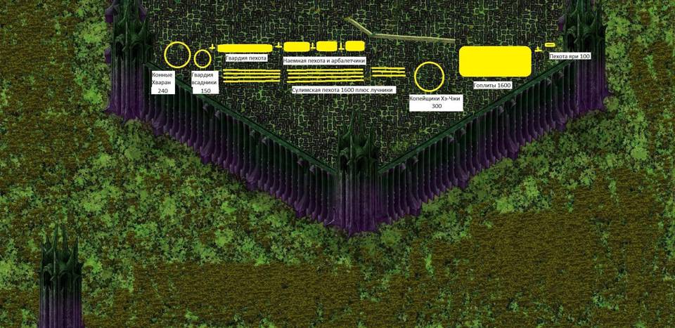 Не гвардейская часть армии в основном состояла из восточных наёмников, но были и цестинцы. Напрягало большое количество всадников хваран. Мне кажется, именно их руками враг попытается сразу захватить инициативу, заняв укрепления в центре карты.
