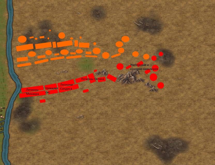 Правый фланг нашей армии и левый фланг вражеской соответственно имели очень приблизительные и постоянно меняющиеся очертания. Кавалерийские отряды быстро сближались между собой, завязывая перестрелки. Остаётся надеяться, что Октан сумеет переконтролить шаддинских стратегов в этих смертельных скачках.