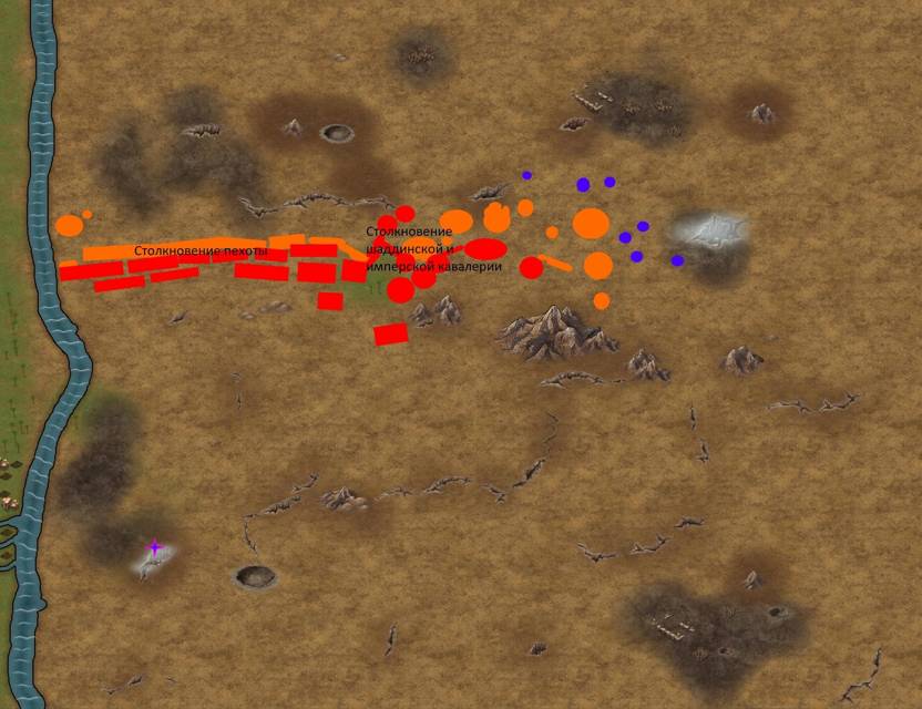Армия Востока перестроилась. Оставшаяся пехота попыталась сформировать одну большую фалангу. Не в смысле особое построение с использованием длинных копий, а просто единую широкую линию. Самая боеспособная кавалерия заняла фланги. В основном правый. Однако четыре сотни бронированных всадников оказались и на левом у реки. В основном там были тяжёлые саваран.