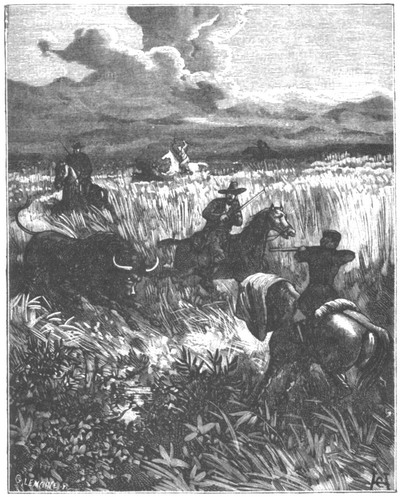 Фрике понял, что скоро можно будет стрелять. Он придержал коня, пустил его сначала рысью, потом шагом, затем остановил. Взял винтовку Гринера восьмого калибра, осмотрел и хотел вновь тронуть коня, как вдруг послышались крики и выстрелы. Парижанин поднял голову. Охотники были от него в двухстах шагах. Сквозь их ряды прорвался огромный бык, раненный в круп и оттого рассвирепевший. Увидев молодого человека, понесся прямо на него.