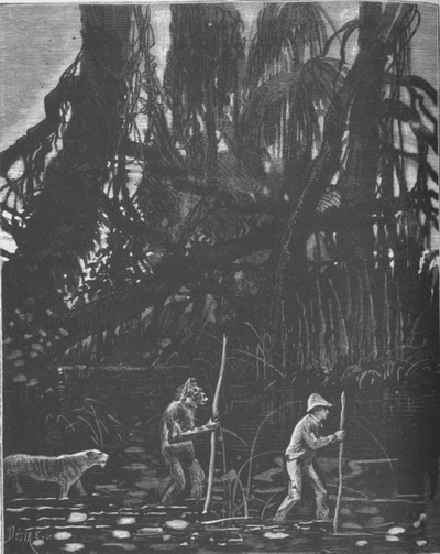 Решимость Фрике с самого начала подверглась тяжелому испытанию. Прежде чем достичь гор, синевшихся вдали зубчатым профилем, ему несколько дней подряд приходилось вязнуть по колено в мутных ручьях, болотах и стоячих водах. Обезьяна следовала за человеком без колебания и храбро барахталась в вонючей воде, но тигр, испытывавший водобоязнь, как все кошки, входил в нее с большим отвращением, и то подгоняемый сердитым фырканьем обезьяны.