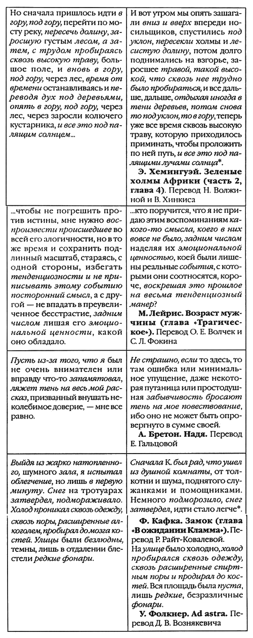 На этом примере хорошо видно, почему мозаичная склейка «Болтуна» из существующих русских переводов не могла быть целесообразным методом работы: в тех случаях, когда Дефоре использует иноязычные тексты, он заимствует материал не из оригиналов, а из переводов на французский. В первой из приведенных фраз нейтральное «warmes Zim-mer» Кафки (Zunächst war К. froh, dem Gedränge der Mägde und Gehilfen in dem warmen Zimmer entgangen zu sein), вполне правомерно превратившись под пером французского переводчика в более акцентированное «chambre surchauffee» (К. se senti d’abord heureux d’être sorti de cette cbambre surchauffée où se bousculaient bonnes et seconds), переносится в текст «Болтуна» именно в таком качестве (Dans la rue, je me senti d’abord heureux d’être sorti de cette salle surchauffée et bruyante).