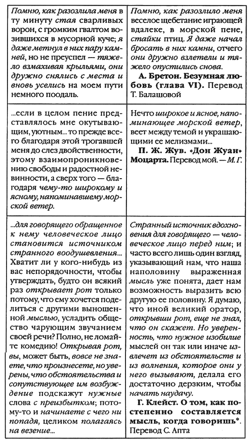 Чтобы дать представление о характере цитирования в «Болтуне», приведу несколько примеров, воспользовавшись обширным реестром Делапланша, попытавшегося «раздергать на нитки» значительную часть повести. (Похоже, автор этого безусловно ценного исследования отчасти переусердствовал: ряд установленных им параллелей может быть поставлен под сомнение, поскольку трудно с уверенностью утверждать, что в этих случаях мы остаемся на уровне сопоставляемых текстов, а не спускаемся на более общий уровень языка. В рамках нашей проблематики знаменателен, однако, сам этот факт смешения уровней.) Ниже в левом столбце даны выдержки из моего перевода Дефоре, в правом – русские переводы его потенциальных источников; курсивом выделены текстуально близкие или соотносимые фрагменты. Подлинники – тексты французских писателей или французские переводы писателей иноязычных – по объясненной причине могут быть гораздо более близки к тексту «Болтуна», вплоть до полного тождества.