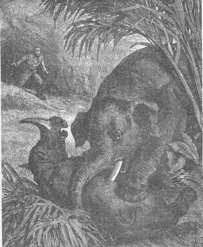 Услышав звуки знакомого голоса, слон бросился в грот, подняв кверху хобот и испуская воинственные крики. Он направился прямо к носорогу, который ждал его, съежившись в углу, не вызывая на бой, но и не убегая от него. Страшное зрелище представляли эти животные, полные одинаковой злобы и ярости.