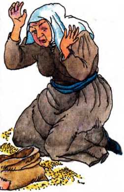 По дороге она встретила бедную старушку с мешком пшеницы за плечами. Вдруг мешок прорвался, и вся пшеница просыпалась на землю.