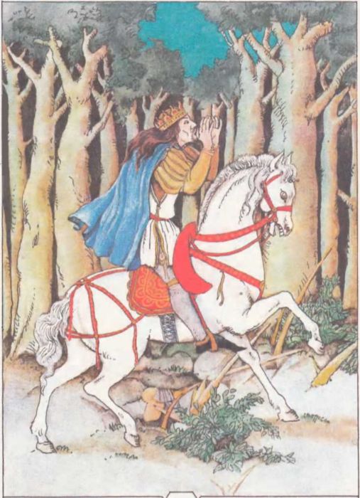 Царь тотчас же приказал оседлать себе самого лучшего коня из царских конюшен, вскочил на него и, как стрела, помчался по дороге в лес. По временам он останавливал коня и кричал: