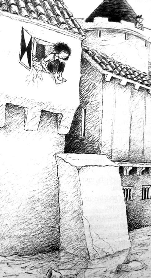 «Похоже, это кухня, – решила Софи. – Попробовать, что ли?» Она просунула ноги в окошко и кое-как села, сжавшись и втянув голову. «Милый Боженька, – молилась она, – не дай мне свалиться в ров». Софи спрыгнула – и приземлилась на выступ стены, покачнулась, но удержала равновесие. Медленно переставляя ноги и раскинув руки вдоль стены, она стала потихоньку пробираться по карнизу. Окно было приоткрыто. Софи осторожно заглянула в прокопченную кухню. Там старушка сидела на корточках перед очагом и раздувала огонь мехом. Молодая женщина подлила воды в котел, висевший на треножнике над огнем, попробовала суп поварешкой и скривила рот.