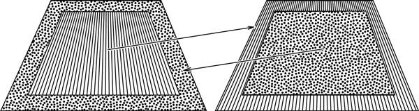 Существуют два способа компостирования навоза и торфа – послойный (рис. 10) и очаговый (рис. 11). При послойном компостировании на компостном месте укладывают торфяную подстилку толщиной 25-30 см. Слой торфа препятствует просачиванию жидких частей навоза в грунт. На него укладывают слой навоза в 25-30 см, затем слой торфа и т. д. Высота бурта – не менее 1,5 м. Самый верхний слой бурта должен быть торфяной. Он поглотит азот, который будет выделяться при разложении компостной массы, и тем самым снизит его потери. Толщина слоёв торфа и навоза зависит от того, каким количеством торфа вы располагаете и какое соотношение выбрали.