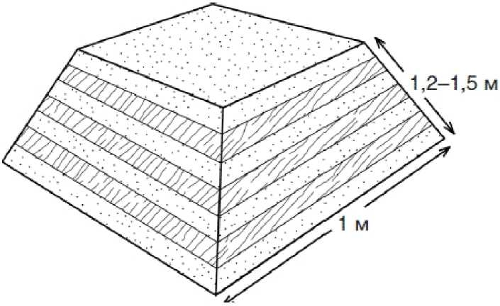 Навозно–земляной компост. Если у вас нет торфа, то можно приготовить навозно–земляной компост. Земли в таком компосте должно быть примерно 25% от веса навоза (на 4-5 частей навоза 1 часть земли). Компостирование проводят послойно, следующим образом (рис. 12). На компостное место насыпают землю слоем 5-6 см. На него кладут навоз слоем 10-15 см, далее прибавляют слой земли 5-6 см, таким образом чередуя слои навоза и земли, доводят высоту бурта до 1,5 м. Сверху бурт прикрывают слоем земли в 8-10 см. Через полтора–два месяца компост следует перелопатить. Полезно добавить в такой компост фосфоритной муки, посыпая ею каждый слой навоза. В таких компостах питательные вещества хорошо сохраняются, так как поглощаются землёй. Если из 10 кг свежего навоза через три месяца хранения летом мы получим 5,6 кг перепревшего навоза, то, прокомпостировав это же количество навоза с землёй, через такое же время мы получим 8,75 кг навозно–земляного компоста.