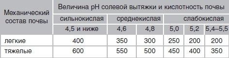 Дозы извести, приведённые в таблицах, так называемые полные дозы, рассчитаны на полную нейтрализацию кислотности корнеобитаемого слоя в один приём на длительный срок (12-15 лет). Их внесение приведёт к снижению кислотности до pH солевой – 5,6-6,0 (соответственно pH водный 6,0-6,5). Такая реакция оптимальна для большинства садовых культур.