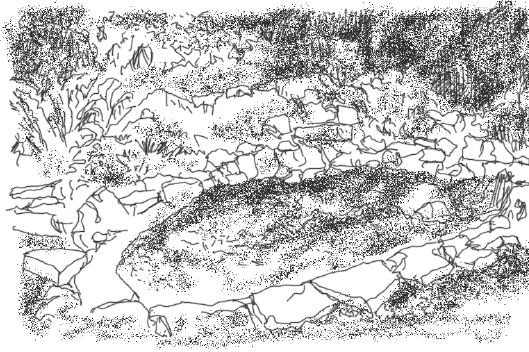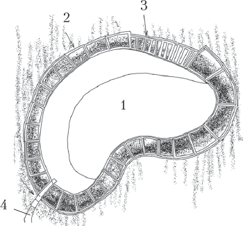 Декоративный мини-пруд в пленочной оправе: 1 – ложе минипруда, застеленное поливиниловой пленкой; 2 – декоративные плитки или плоские камни; 3 – обрезанные изгибы пленки; 4 – трубопровод (шланг) с краном для наполнения пруда водой