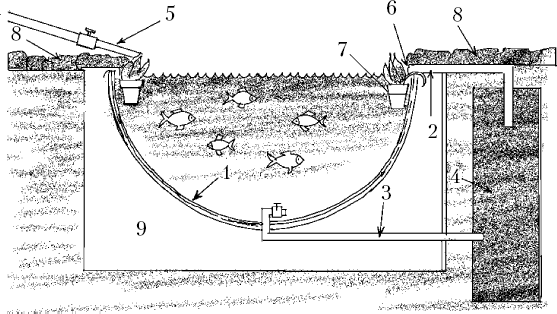 Пруд из цистерны: 1 – корпус полуцистерны; 2 – трубопровод для дренажа излишка воды в пруду; 3 – трубопровод с краном или чопиком для полного спуска воды из пруда; 4 – дренажный колодец, заполненный щебнем; 5 – трубопровод с краном для наполнения пруда водой; 6 – крепление подводных и надводных растений в горшках; 7 – подводные и надводные растения в горшках; 8 – декоративный камень или плитка; 9 – песчаная подушка