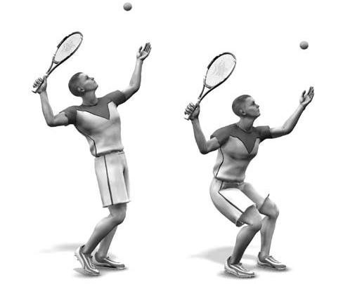 Одновременно с движением ракетки в конечную точку замаха колени сгибаются и таз прогибается вперед так, что центр тяжести тела смещается и теннисист встает на носки. При этом туловище натягивается, как тетива лука, одновременно чуть развернувшись назад (рис. 4.27).