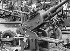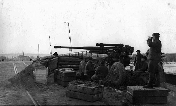 Советская 85-мм зенитная пушка 52-К, установленная на Пролетарском мосту в Туле для борьбы с танками врага