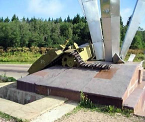 Память сердца: Памятник «Взрыв», 114-м километр Волоколамского шоссе. Из-под колес немецкой танкетки как бы вырывается взрыв – его лучи сделаны из листов нержавеющей стали. У нее перебиты траки и дуло пушки. Памятник облицован красным уральским гранитом. В центре гранитной плиты в торжественные дни зажигается Вечный огонь. Окопы и ходы сообщения выполнены из бетона. Напротив каждой ячейки гранитная тумба, где золотом выписаны фамилии героев-саперов.