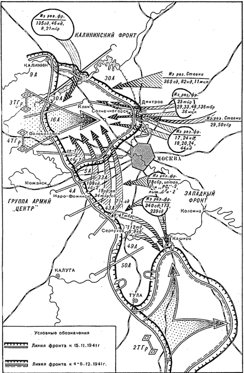 Советское Верховное Главнокомандование, точно определив намерения противника, наносит удары из районов Волоколамска и Серпухова, требует в первую очередь укрепить эти направления. В этих местах сосредоточиваются основные силы Западного фронта и стратегические резервы. Калининскому фронту требуется активной обороной предотвратить переброску сил противника на московское направление. Юго-Западный фронт, в состав которого после расформирования 10 ноября Брянского фронта передаются 3-я и 13-я армии, прикрывается ефремовское и елецкое направления с целью не допустить прорыва врага к путям, связывающим Москву с южными районами страны. На западное направление Ставка ВГК перебрасывает соединения с Дальнего Востока, из Сибири, Средней Азии и других регионов. Одновременно идет формирование 9 резервных армий в составе 59 стрелковых и 13 кавалерийских дивизий, 75 стрелковых и 20 танковых бригад и частей родов войск (к. 36).