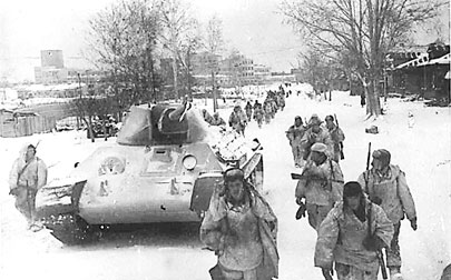 Советские войска на марше. На танк нанесен зимний камуфляж, все бойцы в маскхалатах