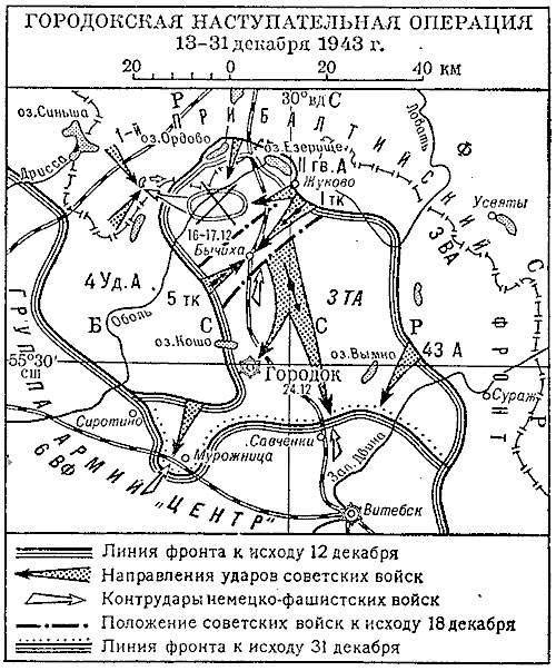 13 декабря 1943 г. началась Городокская наступательная операция войск 1-го Прибалтийского фронта (командующий фронтом – генерал армии И. Х. Баграмян) с целью ликвидации Городокского выступа, образовавшегося на завершающем этапе Невельской операции. В этой операции планируется встречными ударами 11-й гвардейской и 4-й ударной армий в направлении на станцию Бычиха разгромить городокскую группировку противника, овладеть г. Городок и наступать на Витебск. Выступ обороняют немецкие 8 пехотных и авиаполевых дивизий, 1 танковая дивизия и ряд отдельных частей 3-й танковой армии группы армий «Центр».