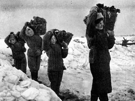 Женщины подносят торф к вагонам для отправки на электростанцию осажденного Ленинграда