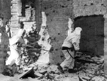 Танки обычно наступали по разным сторонам улицы, на дистанции огневой и зрительной связи. Здания, приспособленные противником к обороне, разбивали осколочными снарядами. Причем танк, шедший по левой обочине улицы, бил по правой ее стороне, и, наоборот, идущий по правой – держал под огнем левую. Такое огневое перекрестье как нельзя лучше гарантировало боевые машины от всяких неприятных неожиданностей. Кроме того, каждому идущему сзади танковому экипажу вменялось в обязанность охранять боевую машину, наступающую впереди. То же самое возлагалось и на пехоту, сопровождавшую танки.