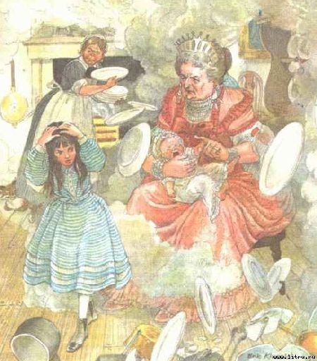 Правда, Герцогиня, казалось, ничего не замечала, даже когда в нее попадало кое-что, а ребеночек и без того так вопил, что никак нельзя было понять, ушибли его или нет. Но Алиса была вне себя от ужаса.