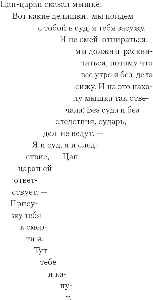 – Вылезем на берег, – сказала Мышь тихим, дрожащим голосом, – и я расскажу тебе мою историю. Тогда ты поймешь, за что я ненавижу кошек и собак.