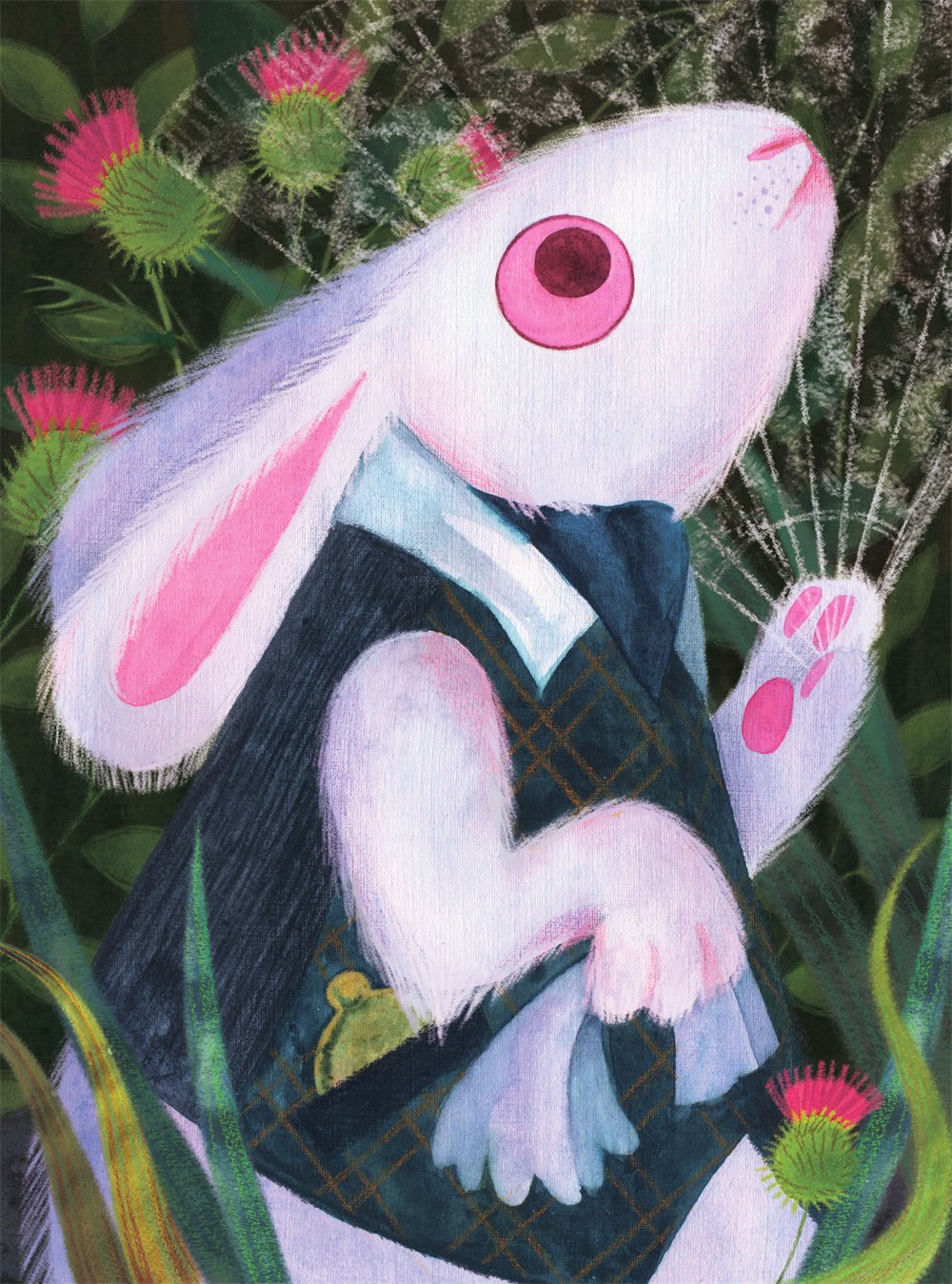 Вдруг мимо пробежал кролик с красными глазами.