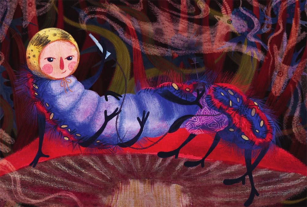 Алиса стала спускаться на землю, что оказалось совсем не просто: шея то и дело запутывалась среди ветвей, так что приходилось останавливаться и вытаскивать ее оттуда. Немного спустя Алиса вспомнила, что все еще держит в руках кусочки гриба, и принялась осторожно, понемножку откусывать сначала от одного, а потом от другого, то вырастая, то уменьшаясь, пока, наконец, не приняла прежнего своего вида.
