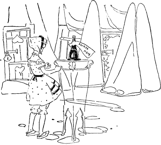 Ожидание у низенькой двери оказывалось бесполезным. Поэтому она вернулась назад, к столу, смутно надеясь, что, может быть, найдет на нем другой ключ или хотя бы книгу правил о том, как складывать людей подобно телескопам. Теперь она заметила на столе небольшую бутылку («Ее, несомненно, раньше здесь не было», – сказала себе Алиса), к горлышку которой была прикреплена полоска бумаги со словами: «ВЫПЕЙ МЕНЯ», великолепно отпечатанными крупными буквами.