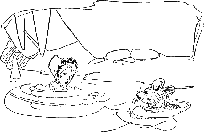 Тут она услышала, будто кто-то плещется совсем недалеко от нее, и подплыла ближе, чтобы рассмотреть, что там такое. Сначала она подумала, что это, может быть, морж или гиппопотам, но затем вспомнила, как она теперь мала, и вскоре разглядела, что это только Мышь, которая, подобно ей самой, поскользнувшись, упала в озеро.