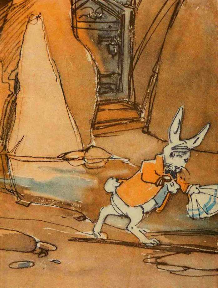 Кролик сильно вздрогнул, уронил белые лайковые перчатки и веер и умчался прочь в темноту так быстро, как только мог.