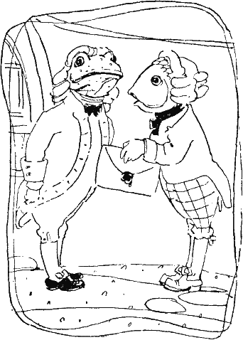 Лакей-Рыба принялся вытаскивать из подмышки огромное письмо почти такой же величины, как он сам, и потом вручил его другому, сказав торжественно: