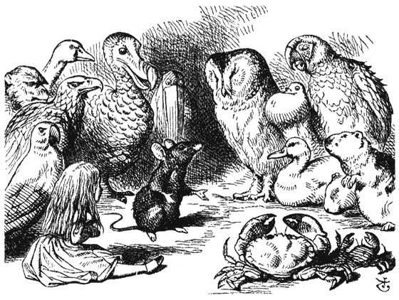 Все послушно уселись в круг, а Мышь стала посредине. Алиса не отрывала от нее глаз – она знала, что если тут же не высохнет, ей грозит сильная простуда.