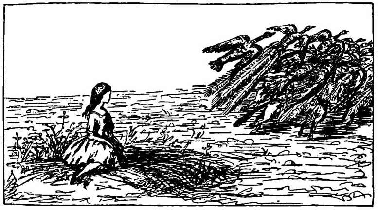 «Напрасно, напрасно я упомянула про Дину! – уныло сказала она про себя. – Никто, по-видимому, ее здесь не любит, я же убеждена, что она лучшая кошка на свете. Бедная моя Дина! Неужели я тебя никогда больше не увижу!» И тут Аня снова заплакала, чувствуя себя очень угнетенной и одинокой. Через несколько минут, однако, она услышала шуршанье легких шагов и быстро подняла голову, смутно надеясь, что Мышь решила все-таки вернуться, чтобы докончить свой рассказ.
